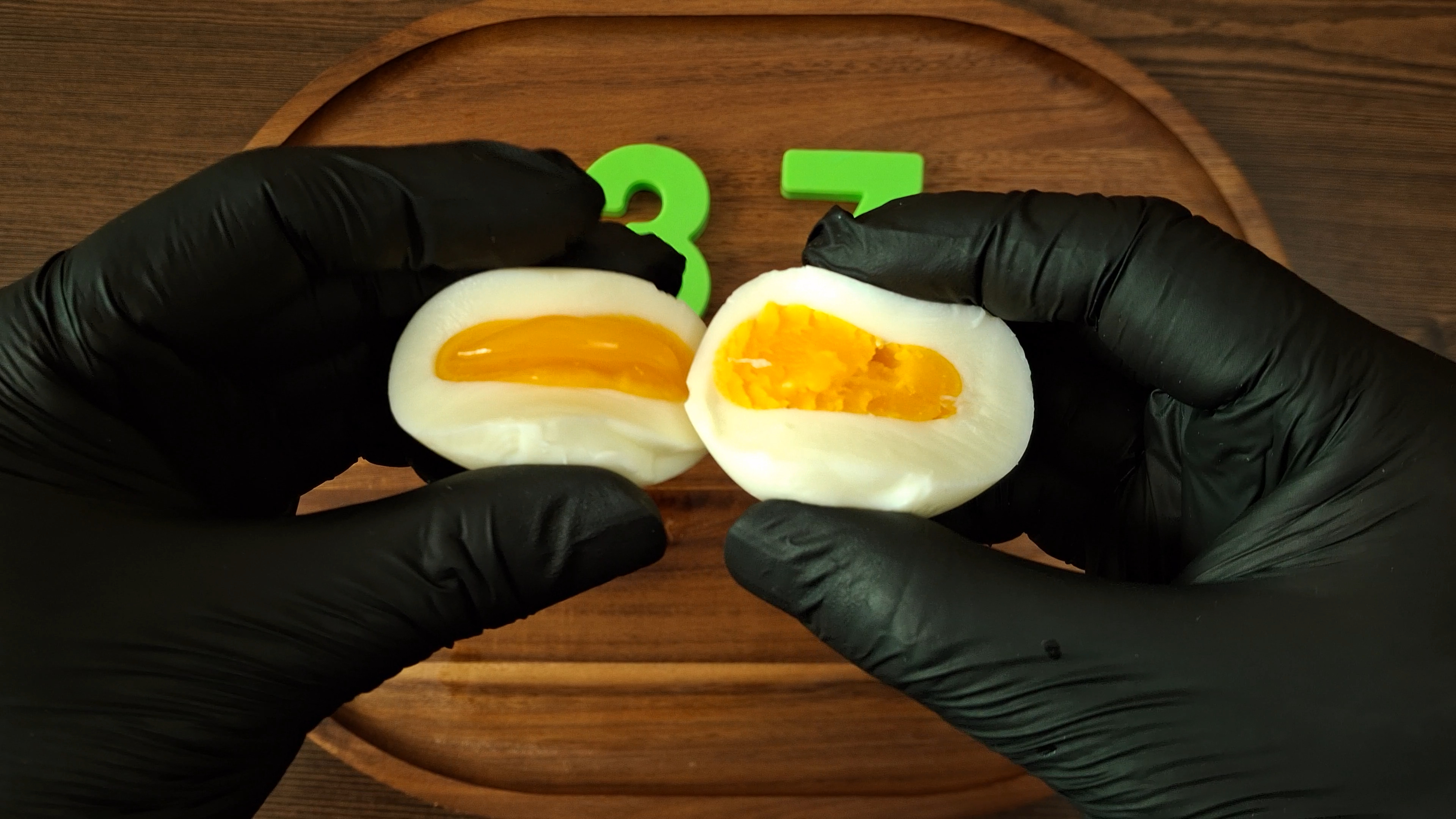 - 여열로 마무리하기: 4분 후 불을 끄고 계란을 그대로 둡니다. 이 때 방치 시간에 따라 계란의 익힘 정도가 달라집니다: